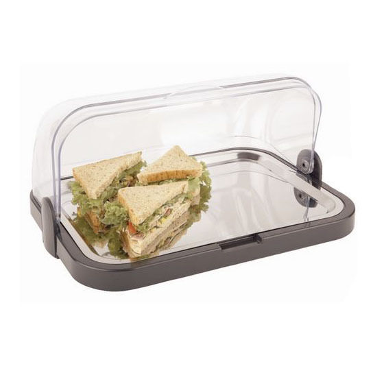 This APS roll top cool display tray includes a stainless steel tray with two cooling packs in the base for long lasting freshness, great for displaying handmade sandwiches and other lunchtime food items.