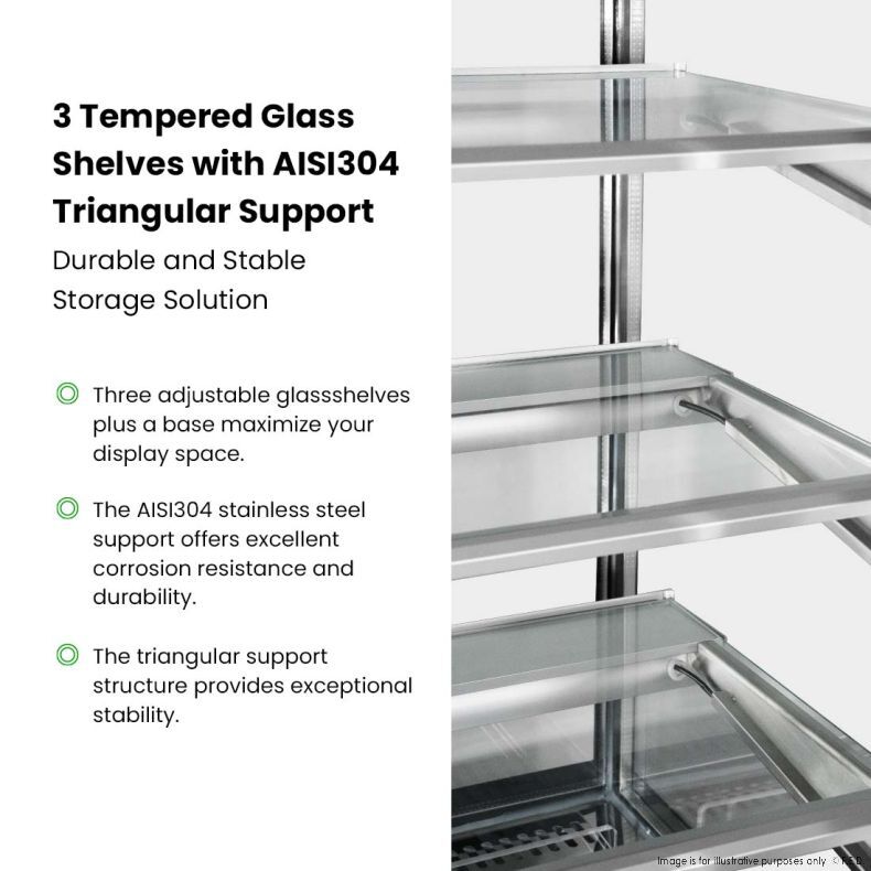 • 3 Tempered glass shelves with AISI304 triangular support