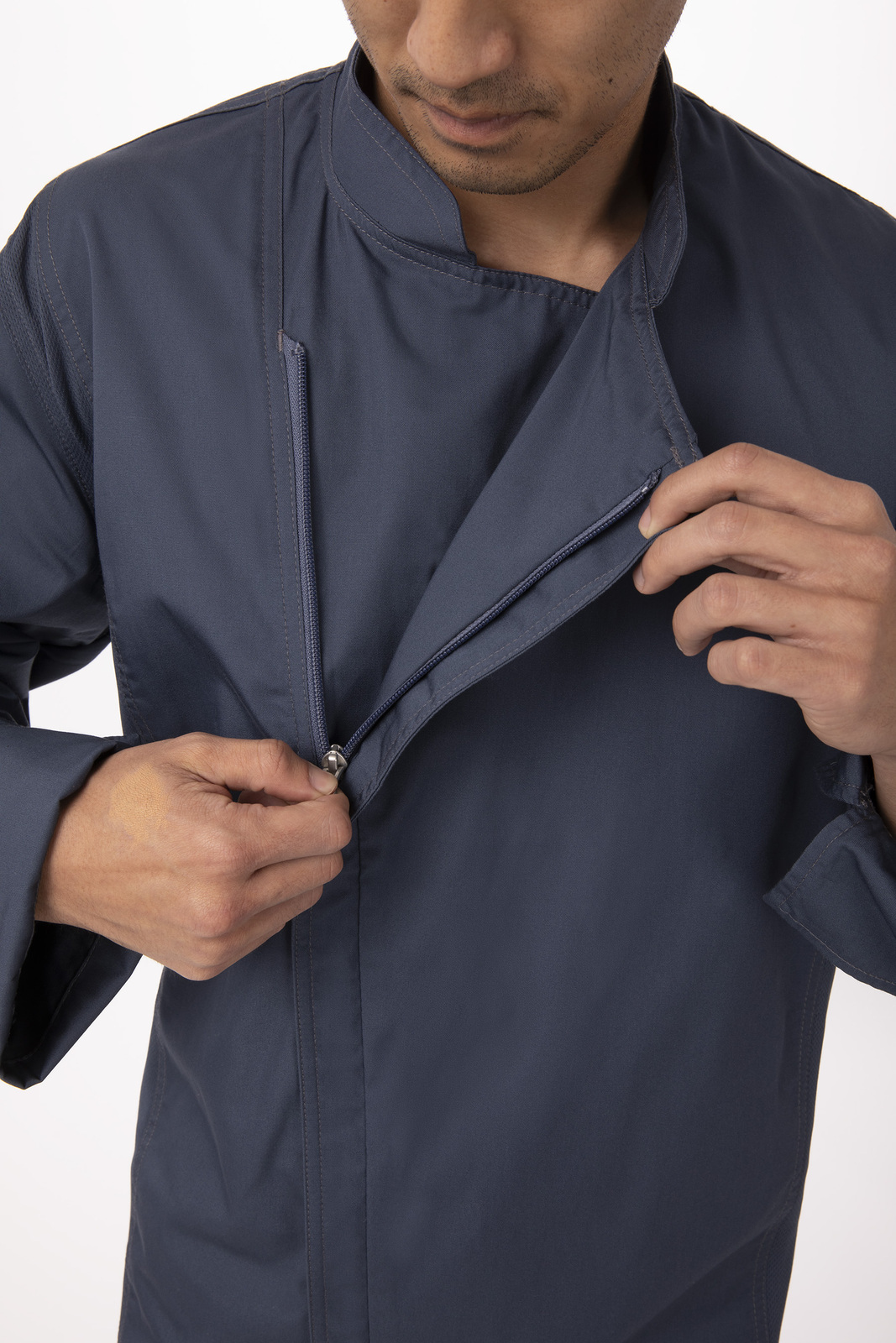 • Single-breasted with zipper closure