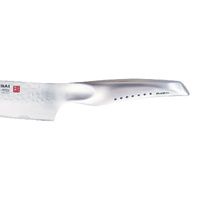 The central layer with cutting edge is of CROMOVA 18 Stainless Steel, hardened to Rockwell 58-59 degrees and honed to a fine edge to give awesome cutting performance. This is sandwiched between two layers of softer SUS410 Stainless Steel material, which helps to protect the blade against chipping rusting and staining. A new, hammered finish is applied to the sides of the blade. This is not purely decorative. The air pockets resulting from this result in a better release of food being cut, giving the blade non-stick properties.