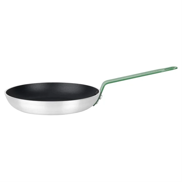 The pan's handle is colour coded green, which typically signifies it's used for preparing fruit and vegetables ingredients. To help you colour-code your kitchen items to minimise the risk of cross-contamination, the 240mm Hygiplas non-stick frying pan is also available in blue (HT971), red (HT965) and purple (HT968).