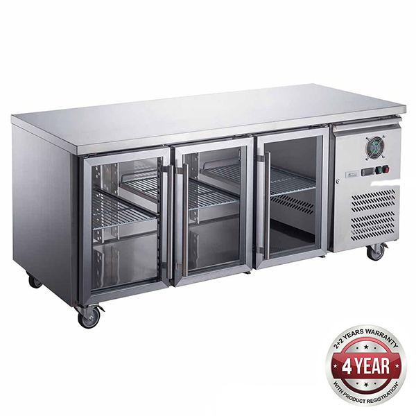 Three glass door bench fridge 417L ext 1795X700X850