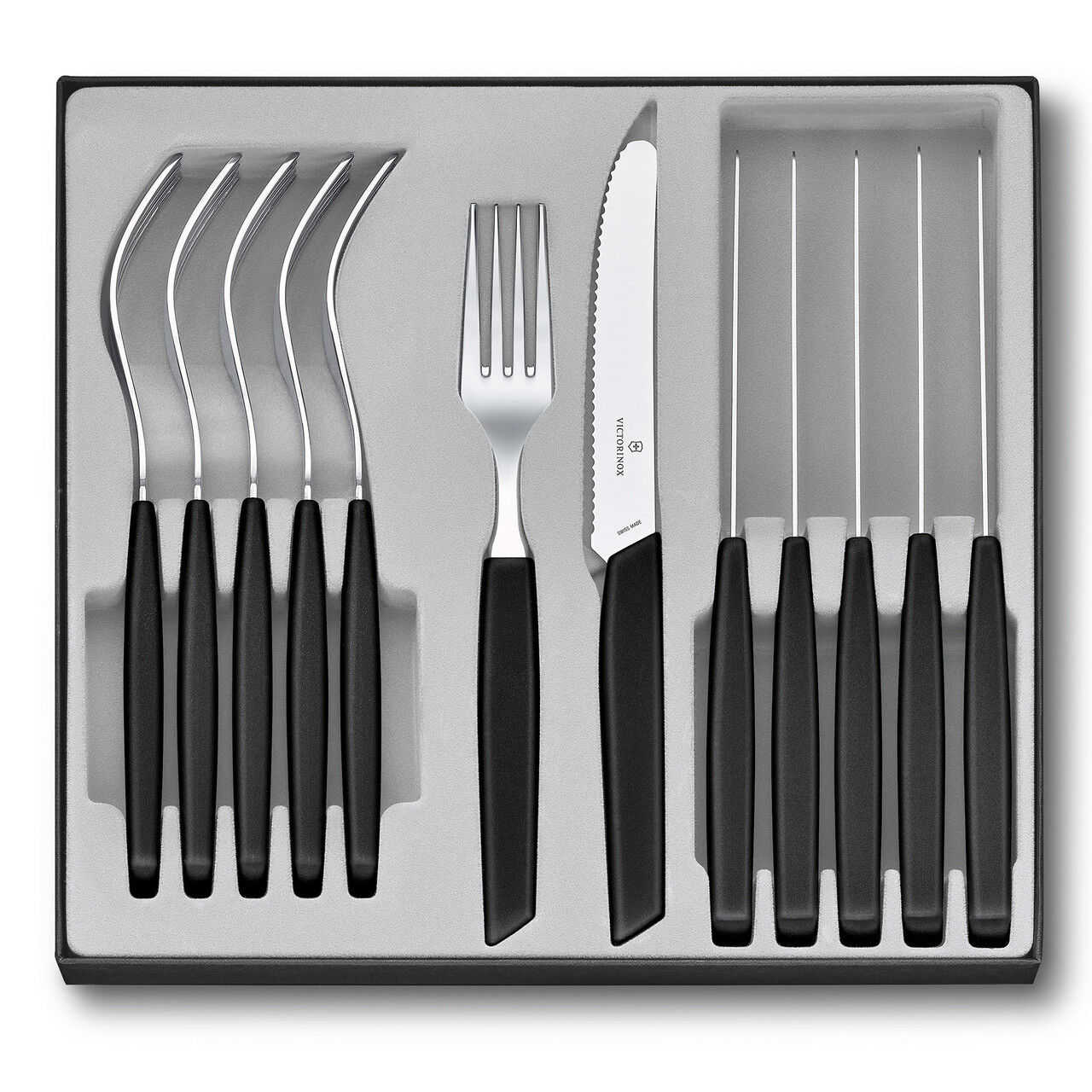 • Swiss made set with 12 pieces and modern-shaped synthetic handles