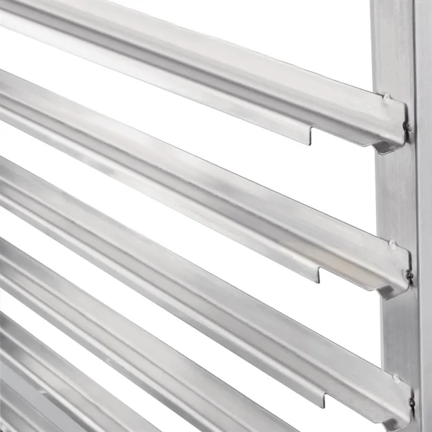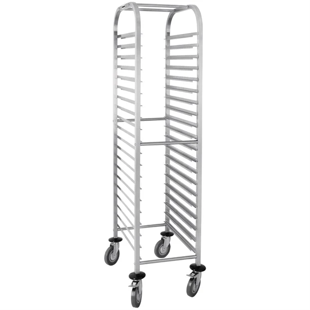 Stack, store and move large numbers of gastronorm trays in this racking trolley. Designed to carry 1/1 GN size trays with an 80mm clearance between each shelf, the trolley is fitted with four castor wheels which makes it remarkably easy to push or manoeuvre. Two of the wheels have brakes for complete control. Four bumpers are also included to prevent any damage to the trolley, as well as to walls or door frames in the event of an accidental bump.
